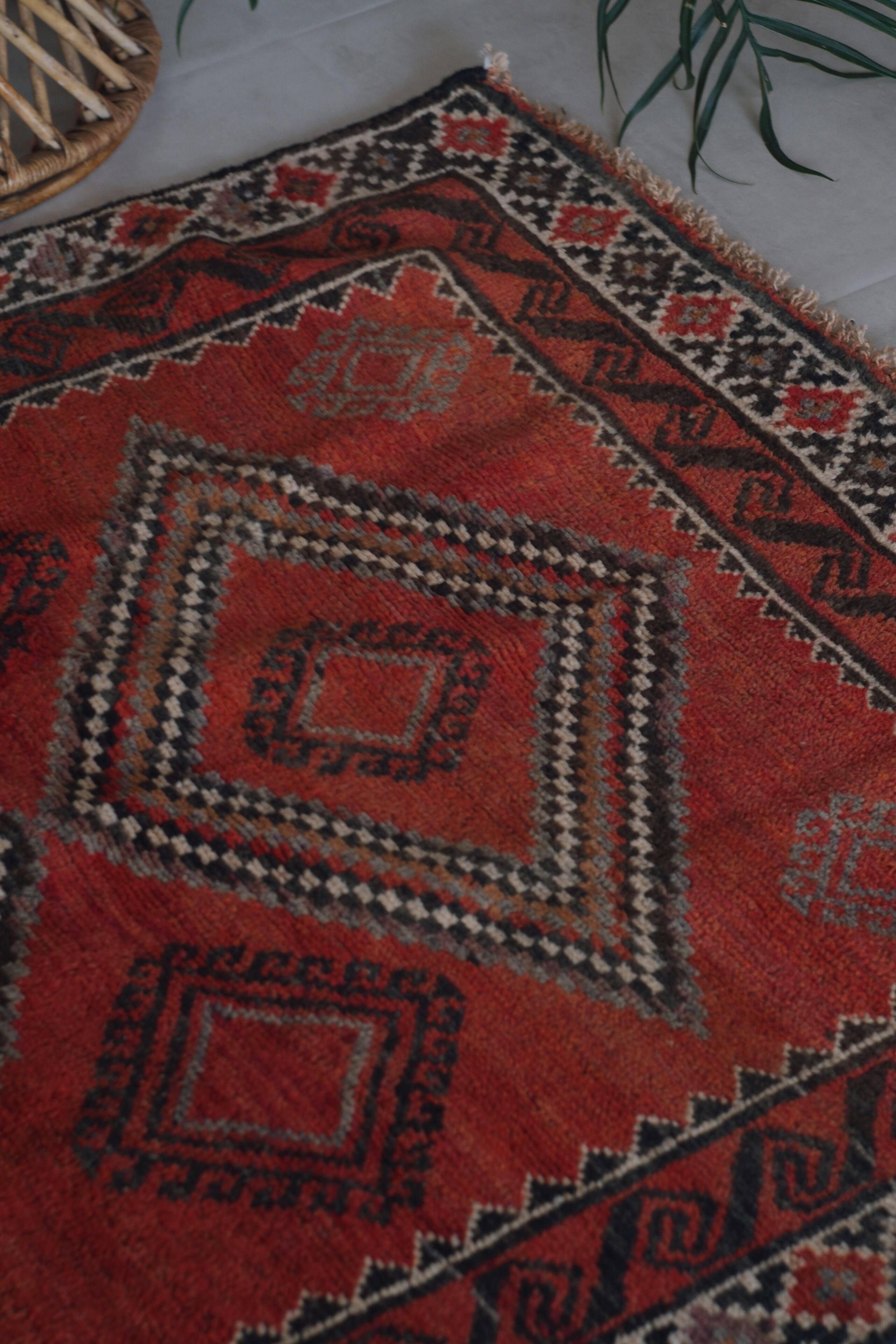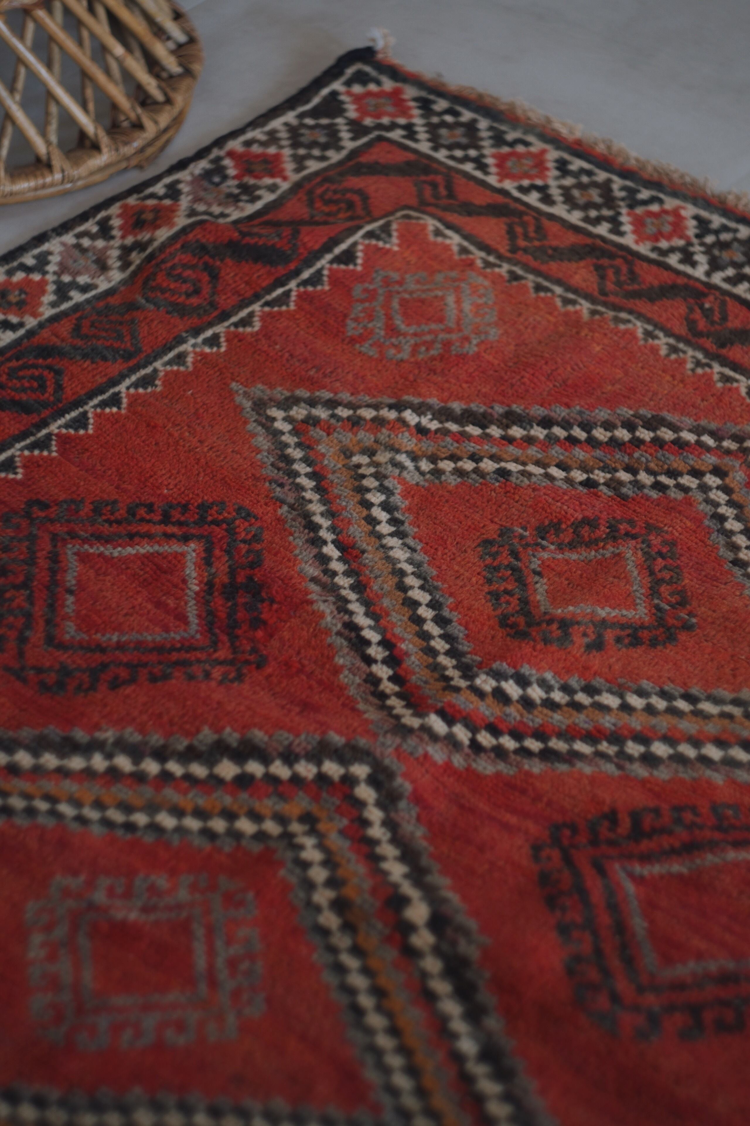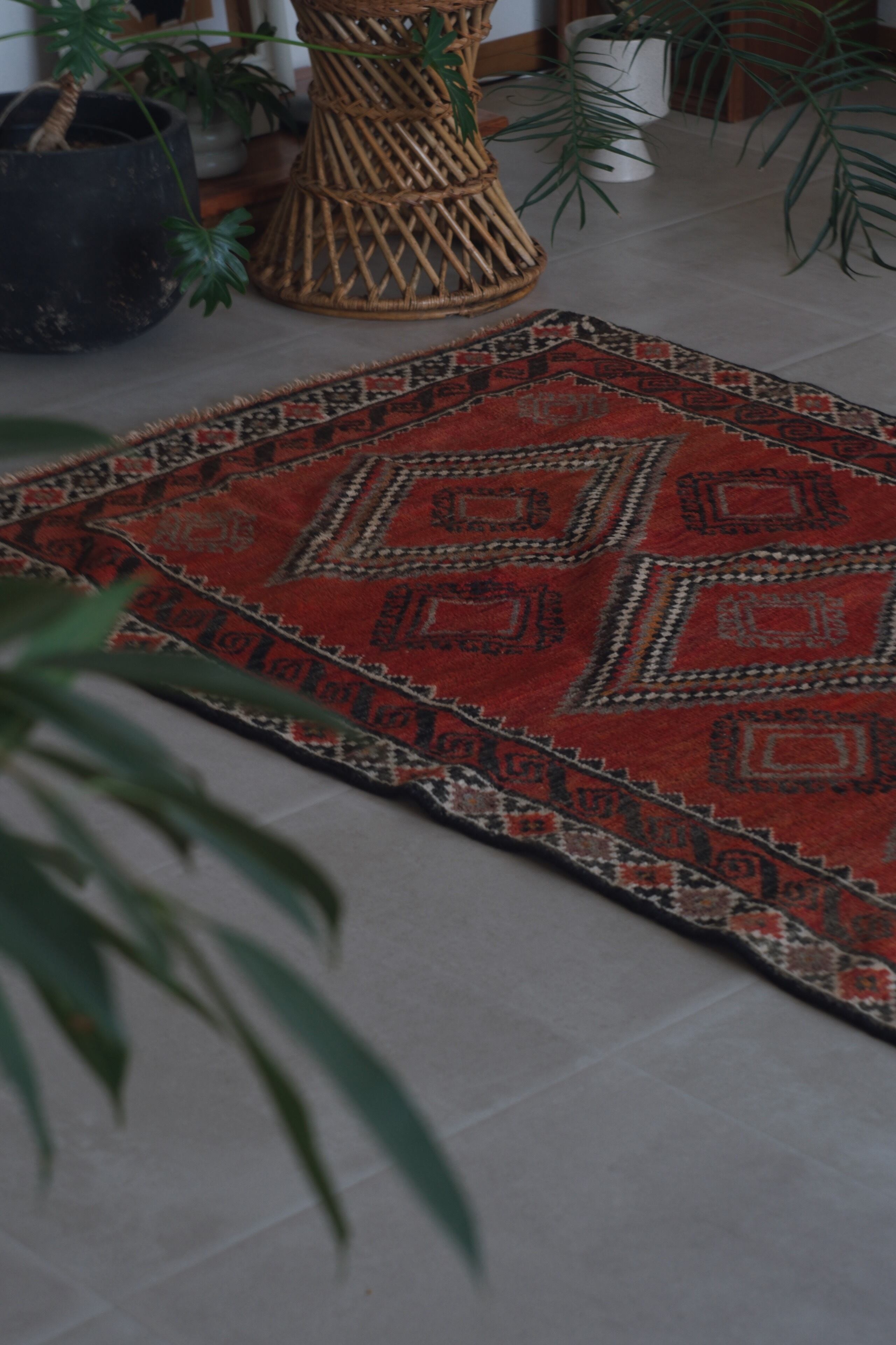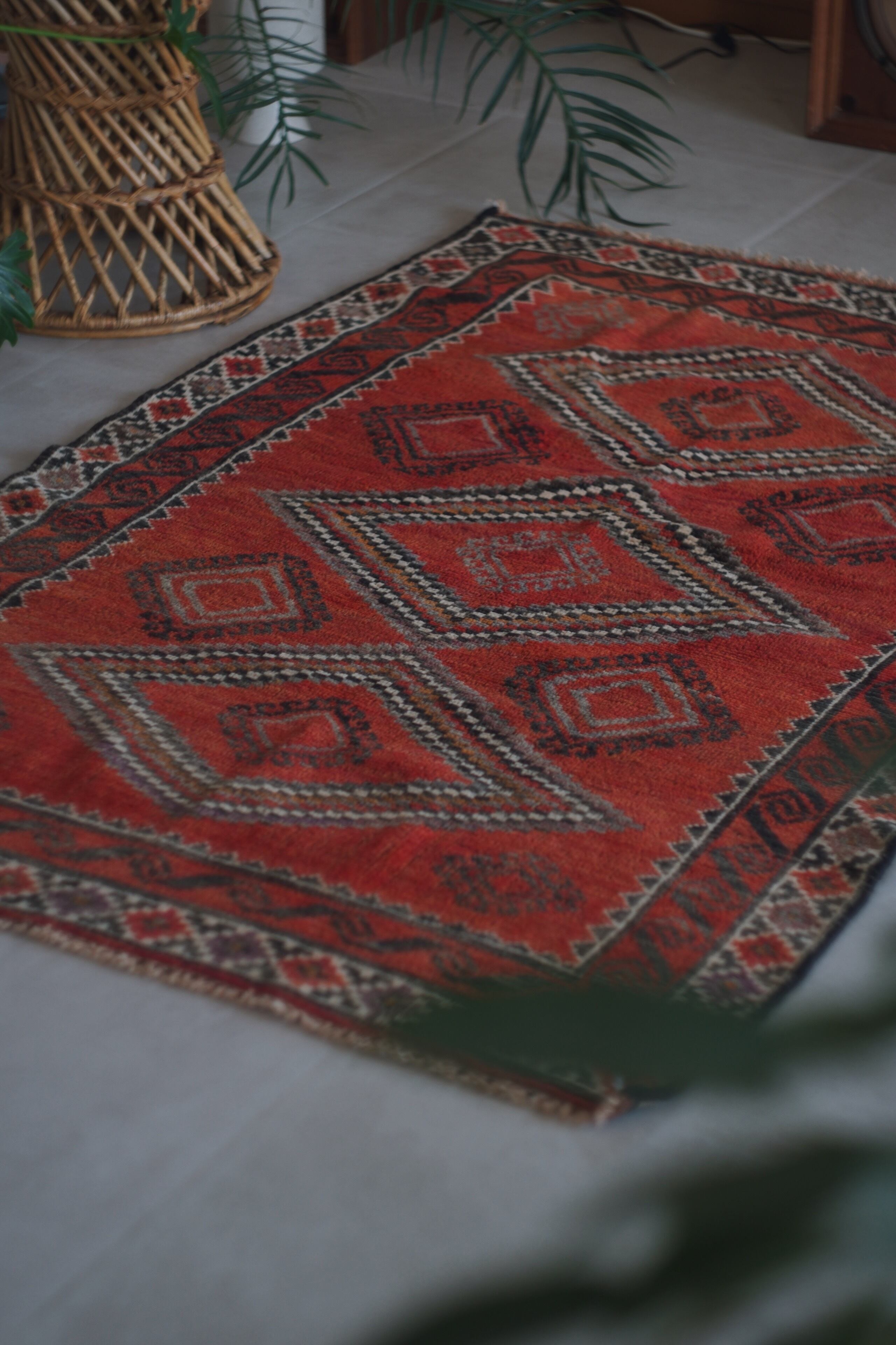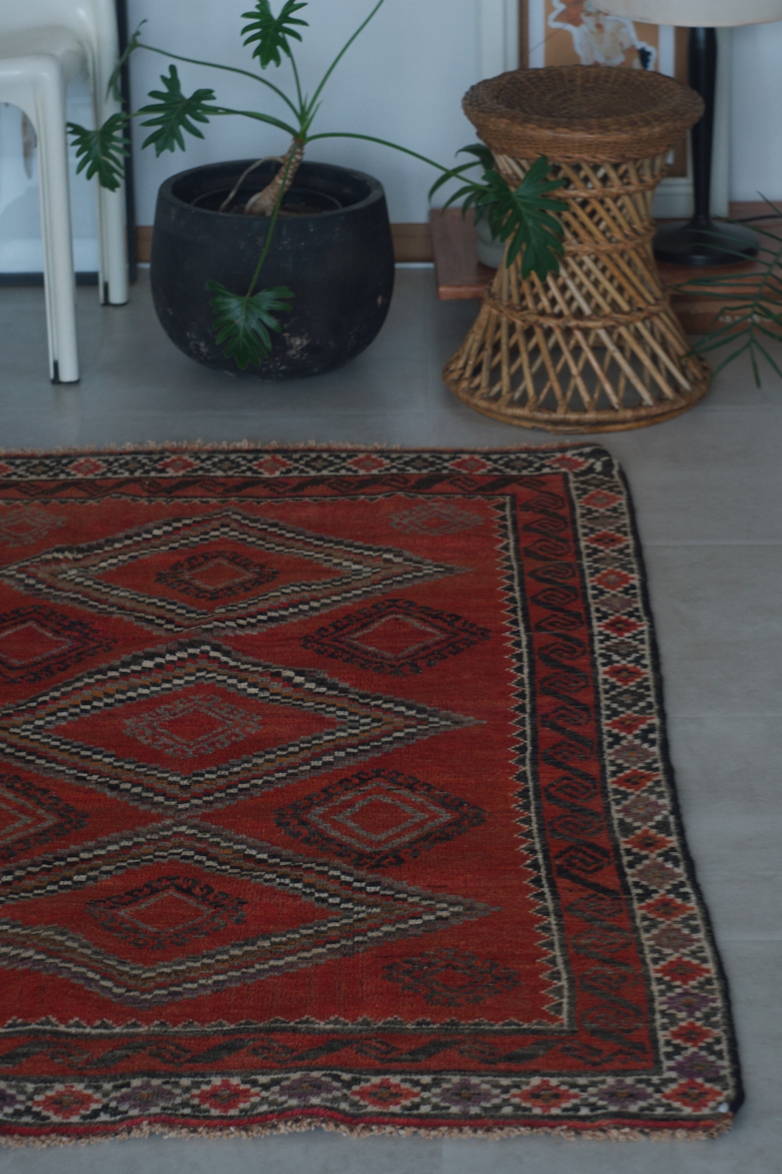 なんだかんだ目を引く赤色アフガン。あまり見かけないデザインのものを入荷しました。フィールドにどんっと入った三連のひし形の柄とガードには少しかわいらしい印象の柄が。濃いウッドのヴィンテージライクな家具とも相性ばっちりです。一枚あるとなにかと使える赤色アフガン。使いやすいいサイズ感なのでおすすめです。