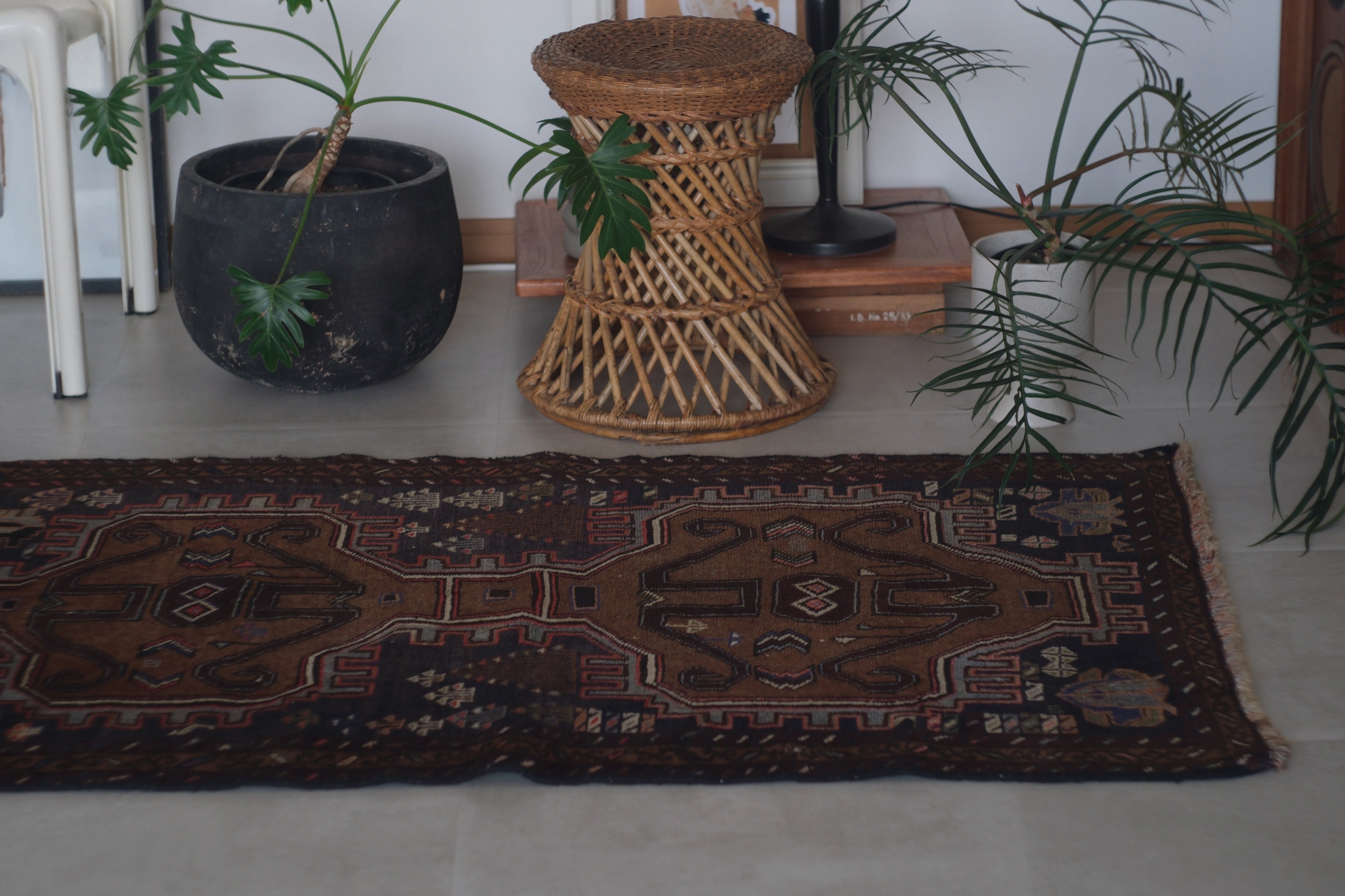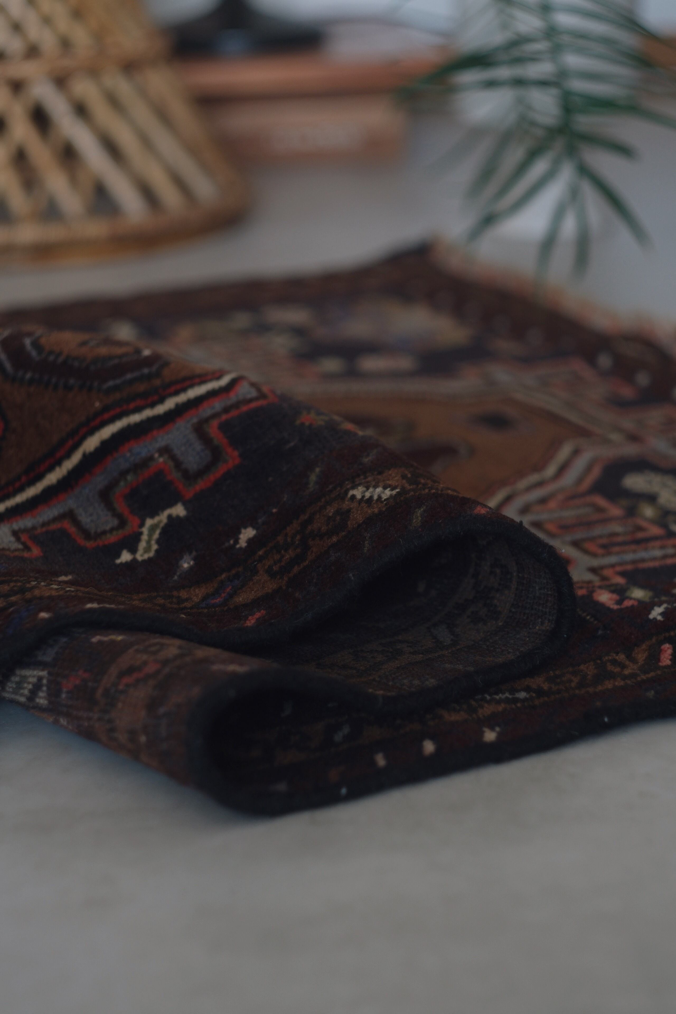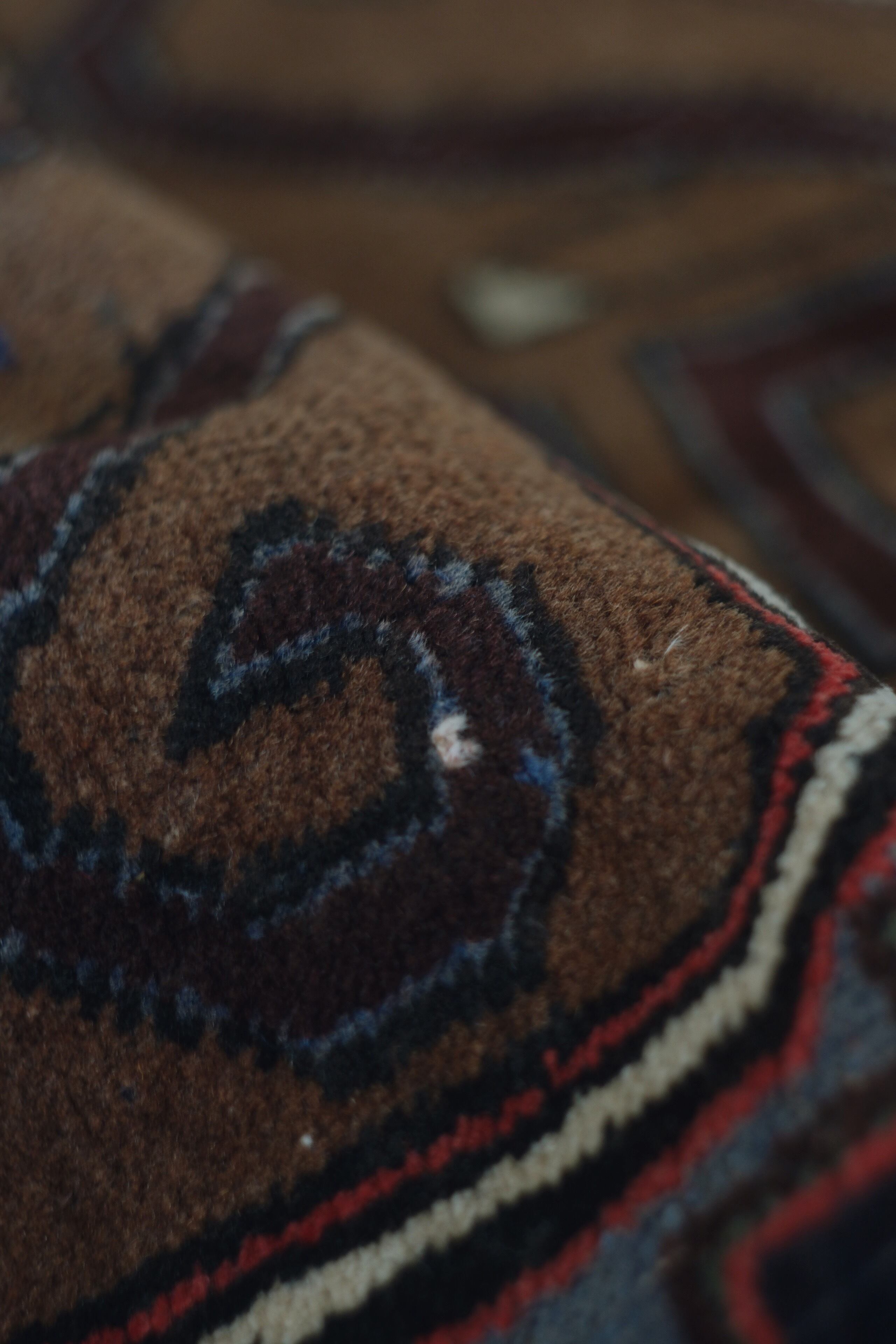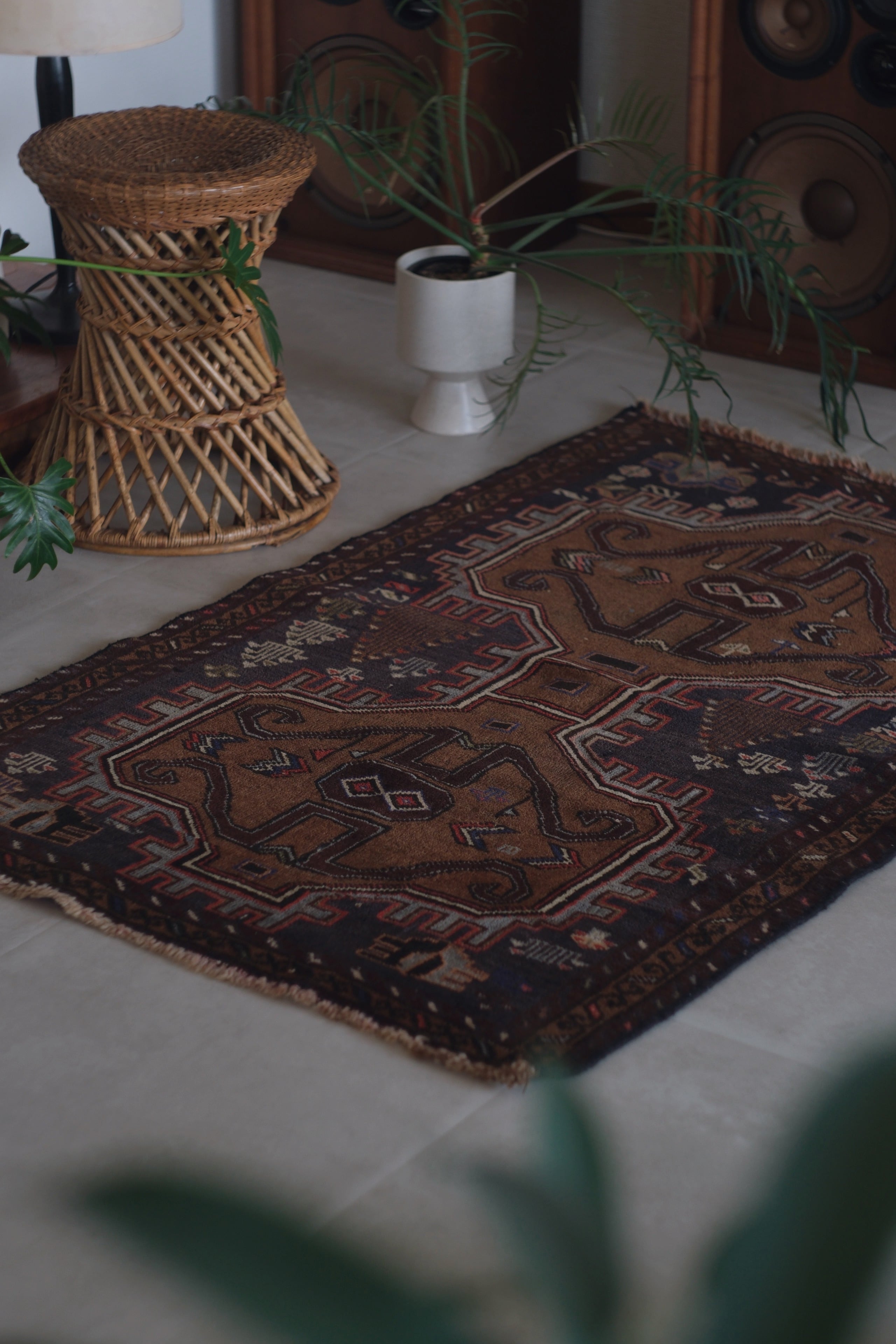 ブラウンとネイビーを基調としたとてもシックな一枚。落ち着いた配色の中にときおり入る水色などの明るいカラーが柄を際立ててくれています。短すぎず長すぎないパイルがぎゅっと詰まった中厚の踏み心地を感じる素材完です。これからの季節にもぴったりのおすすめのアフガンラグです。