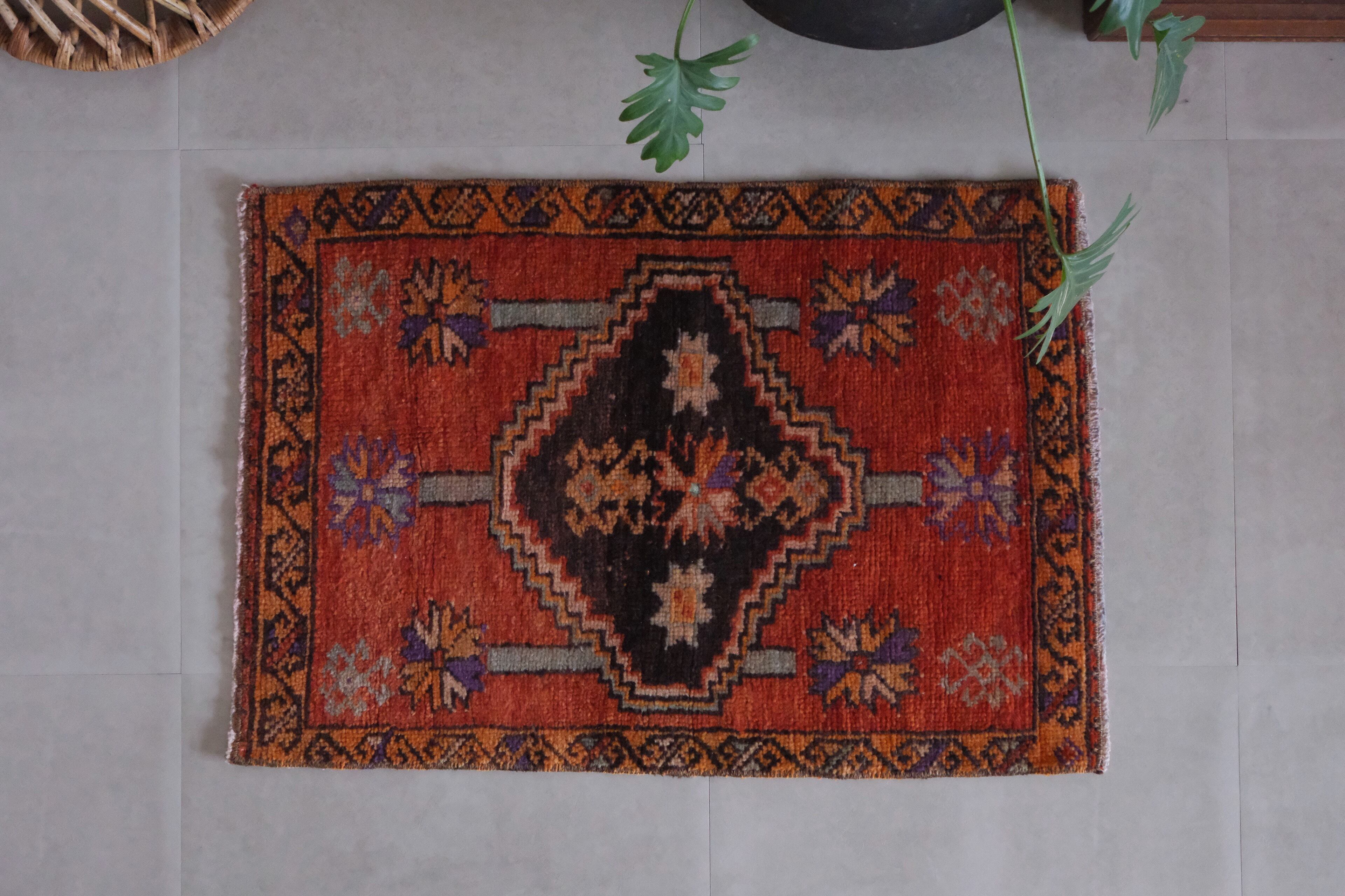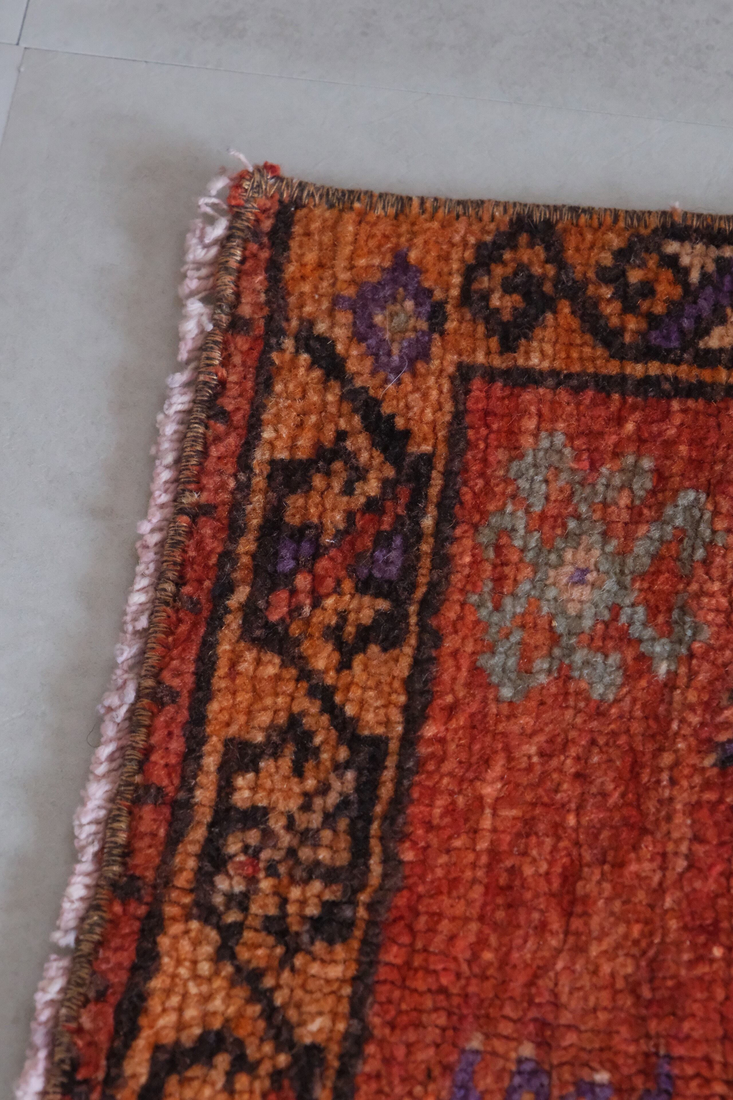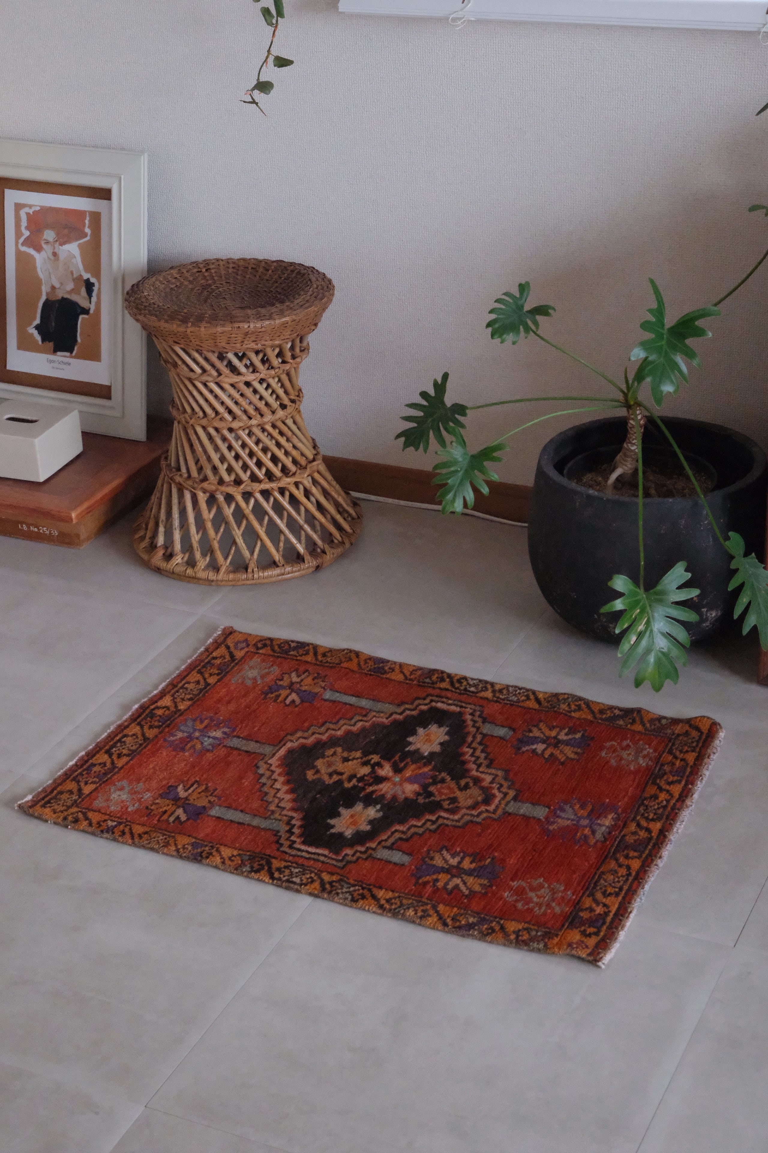 明るく濃いめのオレンジベースにカラフルな色使って模様が入っています。水色やパープルの反対色がアクセントに。パイル残りが良く、やわらかいけどふっくらとしたラグです。