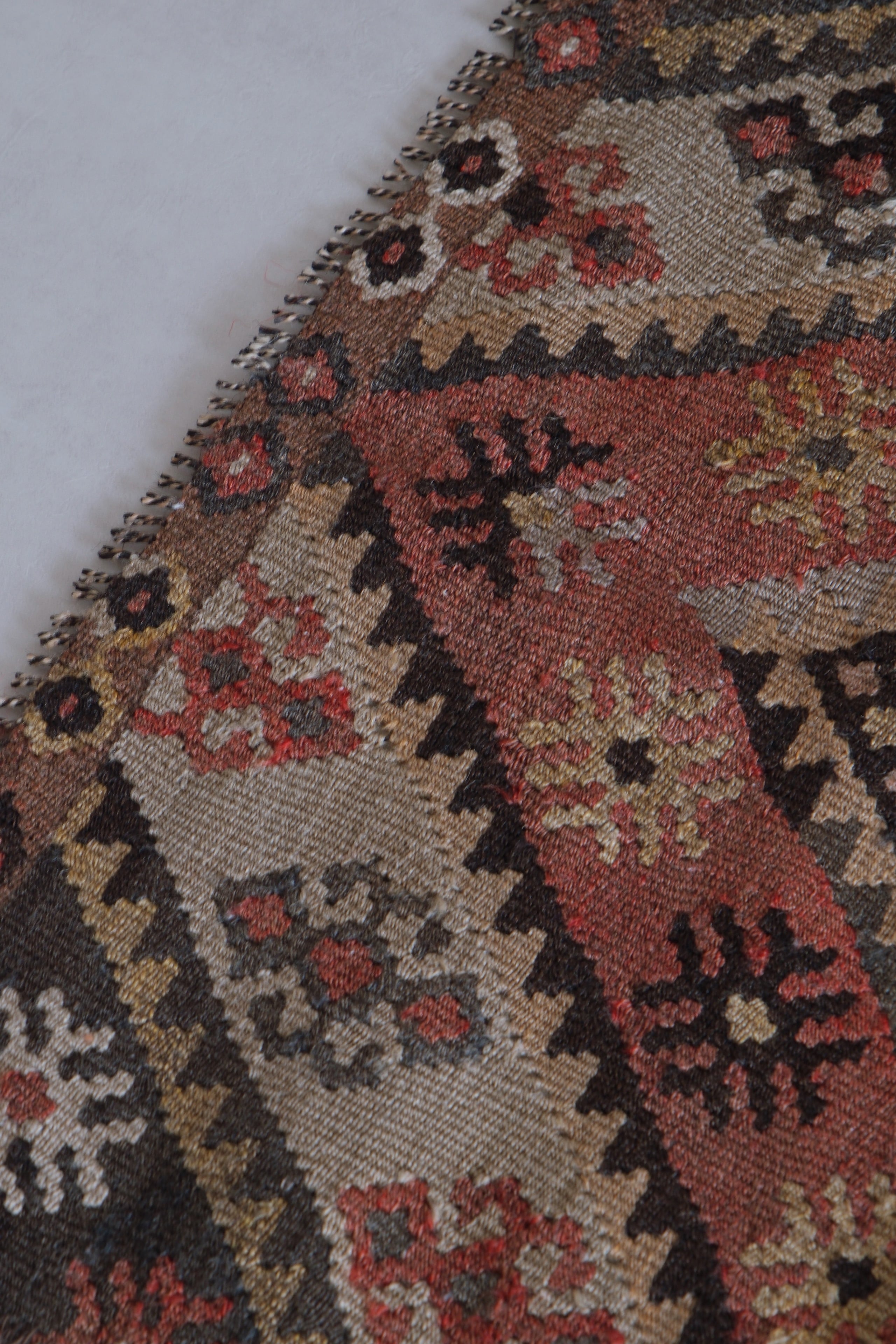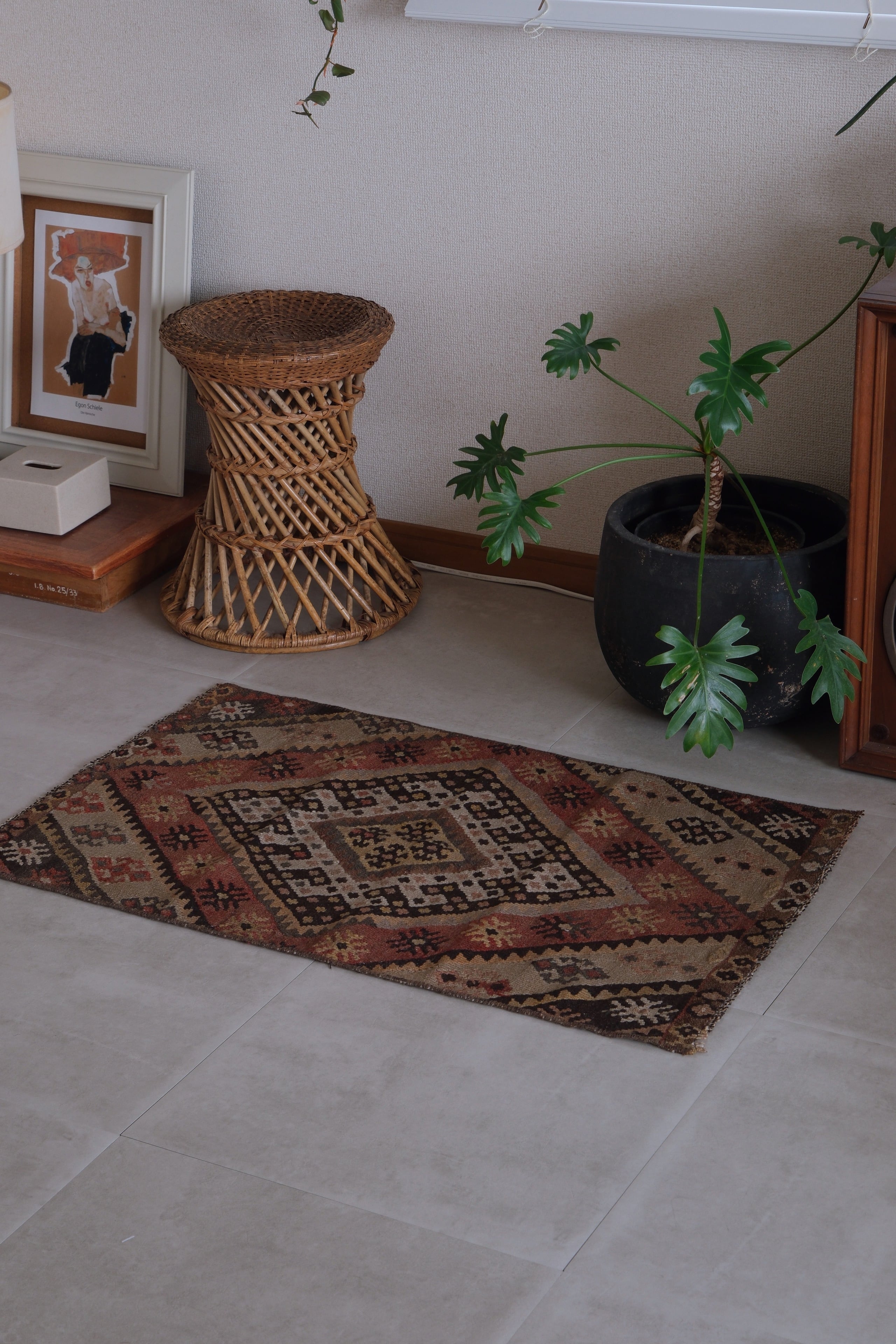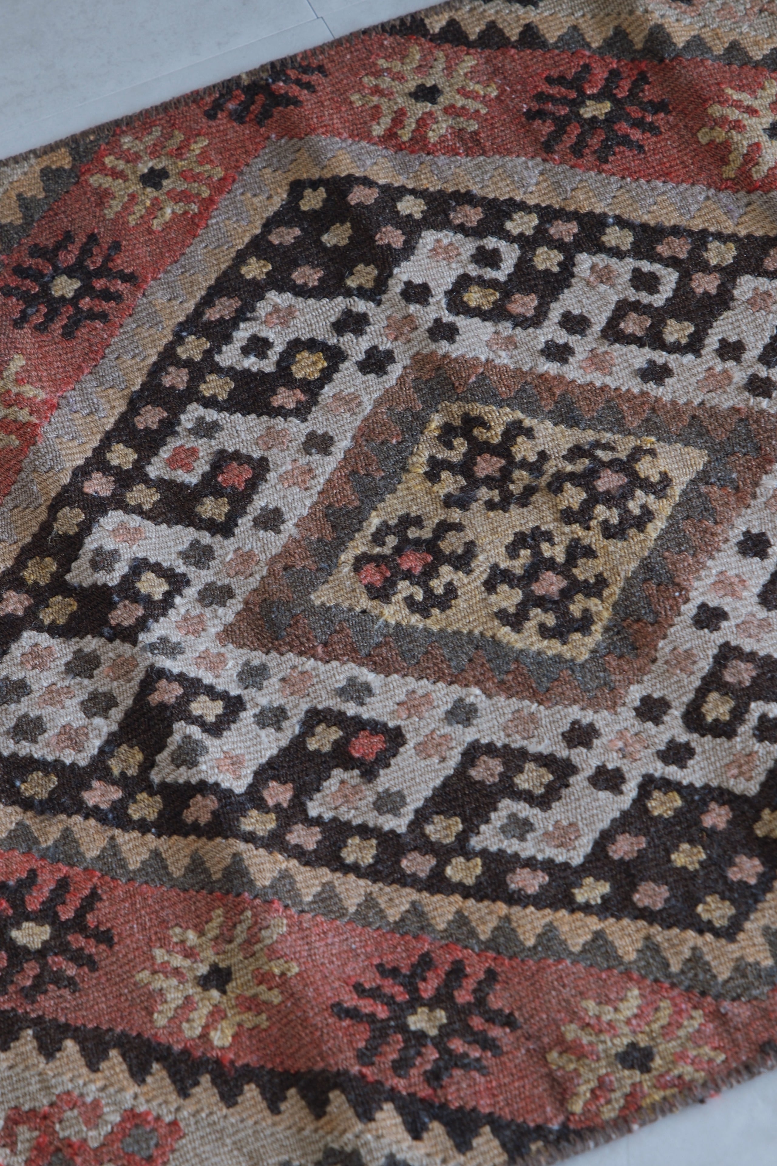 カラフルでかわいいキリムラグ。王道キリムの柄ですが配色がシックさとかわいさを兼ね揃えていておすすめの一枚です。敷くのはもちろん壁に飾っても◎毛足がなくお手入れしやすいキリムならではの特性なのでペットのごはんスペースにもおすすめです。
