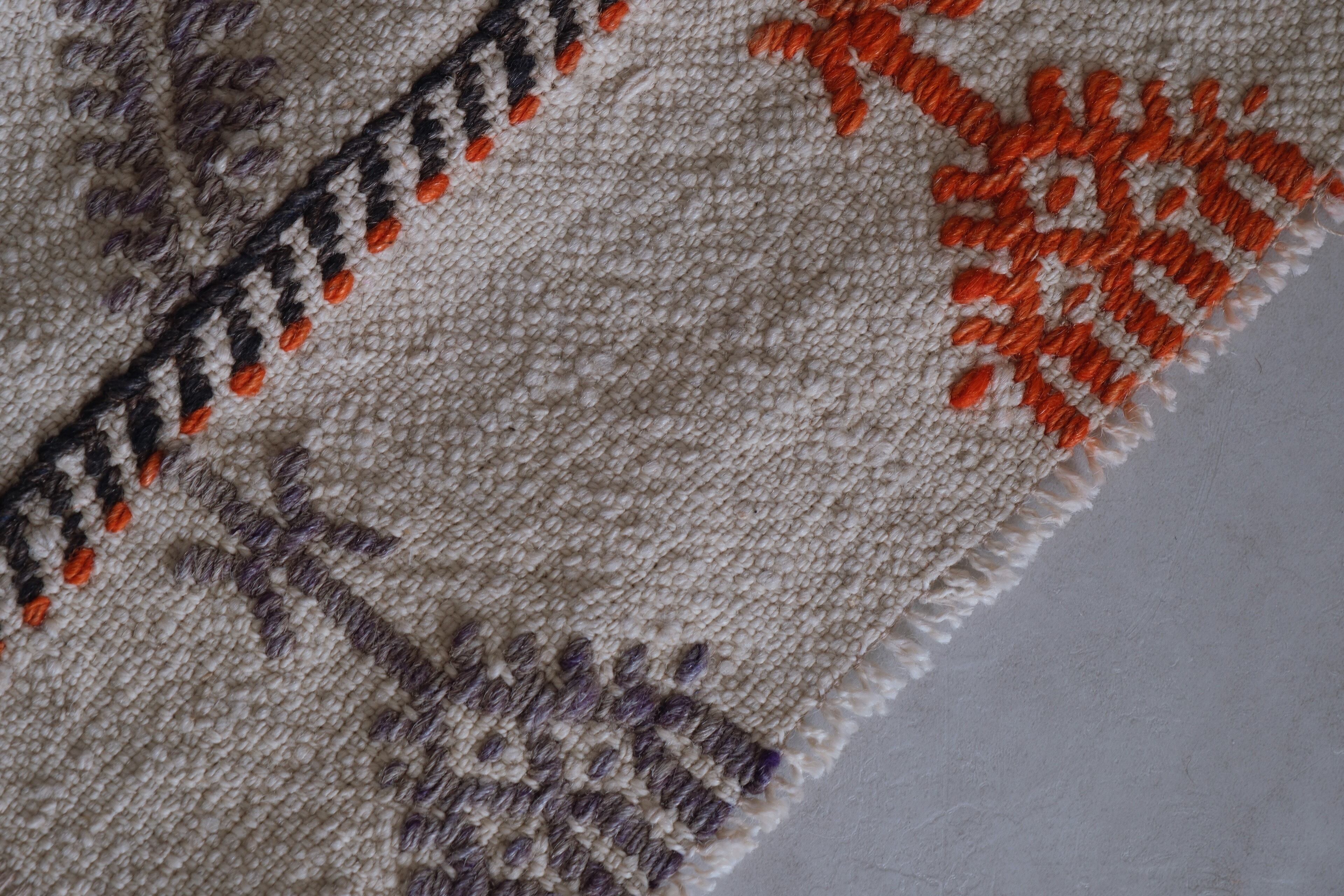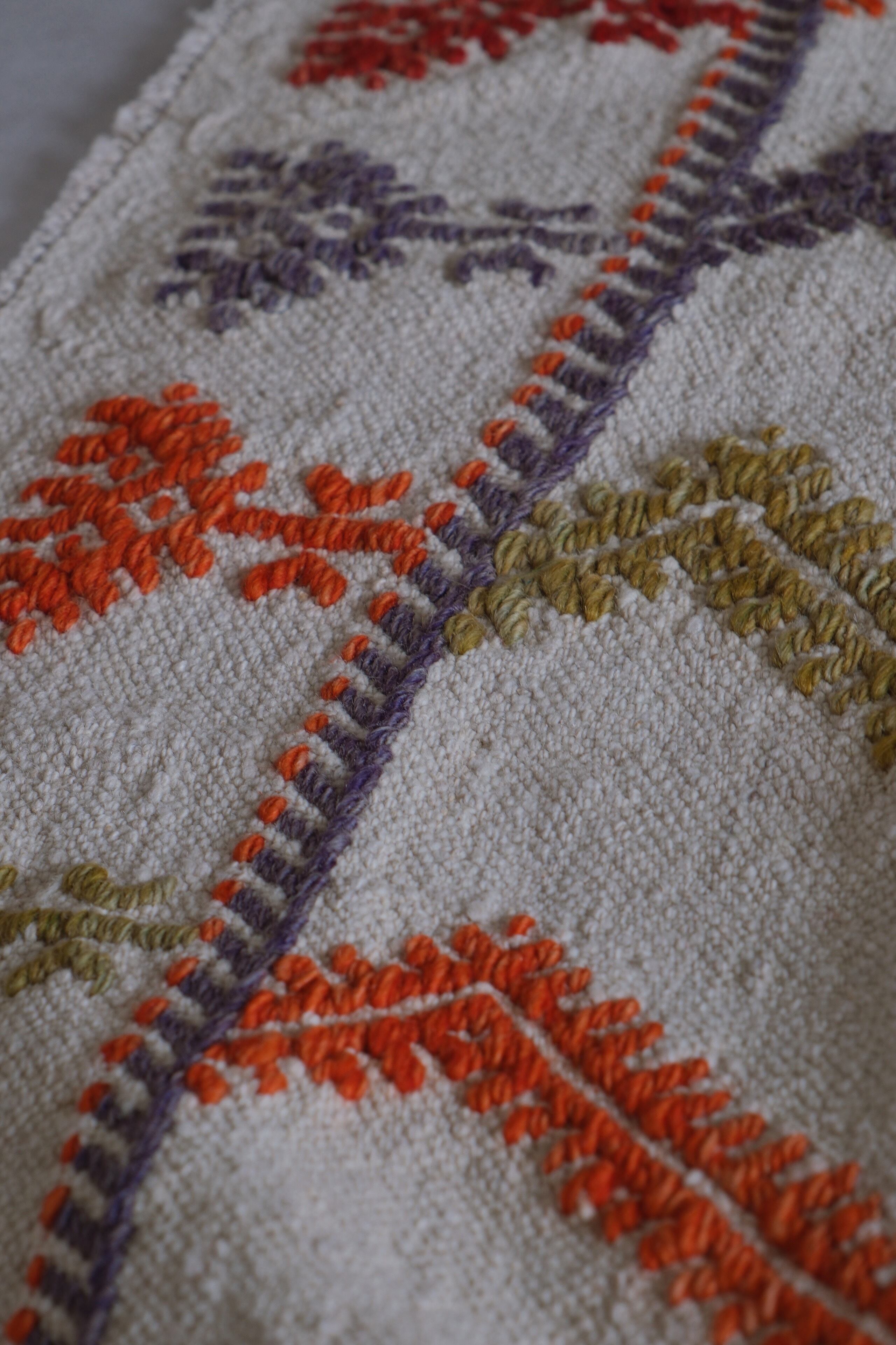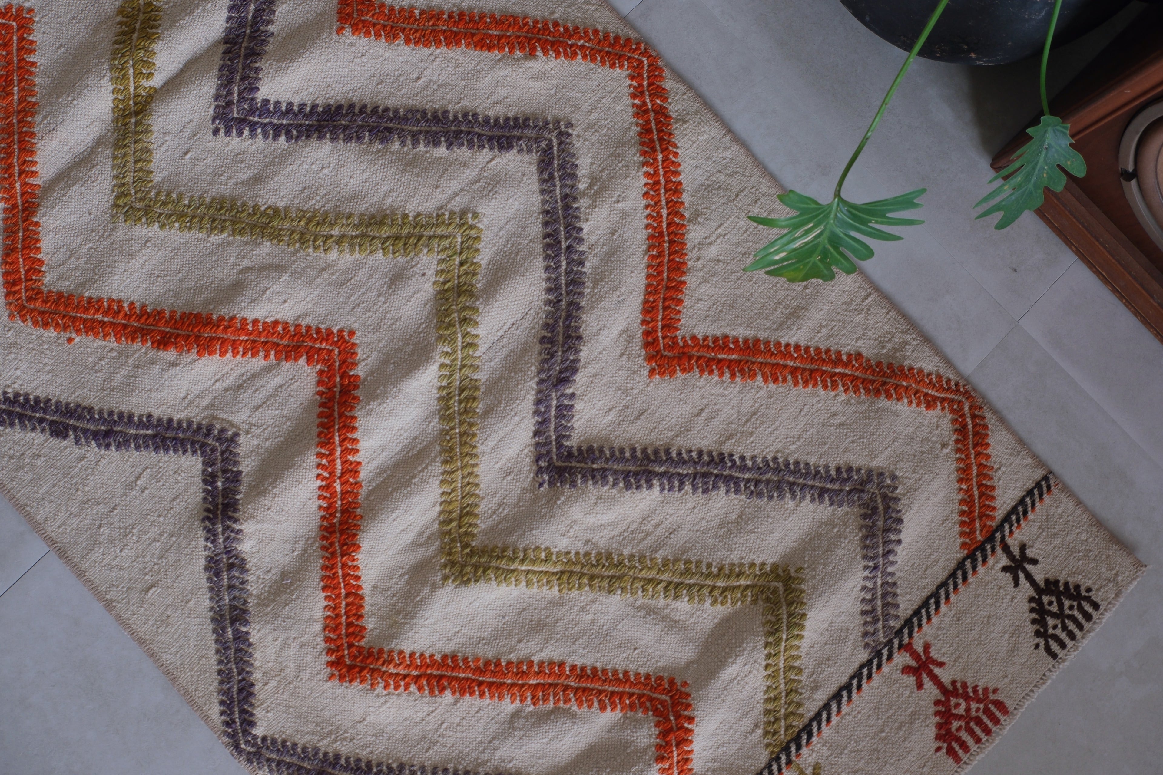 カラフルなラインがセンス溢れるキリムラグ。ベースはシンプルな生成りなのでお部屋に合わせやすいです。一人暮らしでも使いやすいサイズ感です。お部屋の億セントになること間違いなし。個人的にはキッチンに敷きたい一枚!!