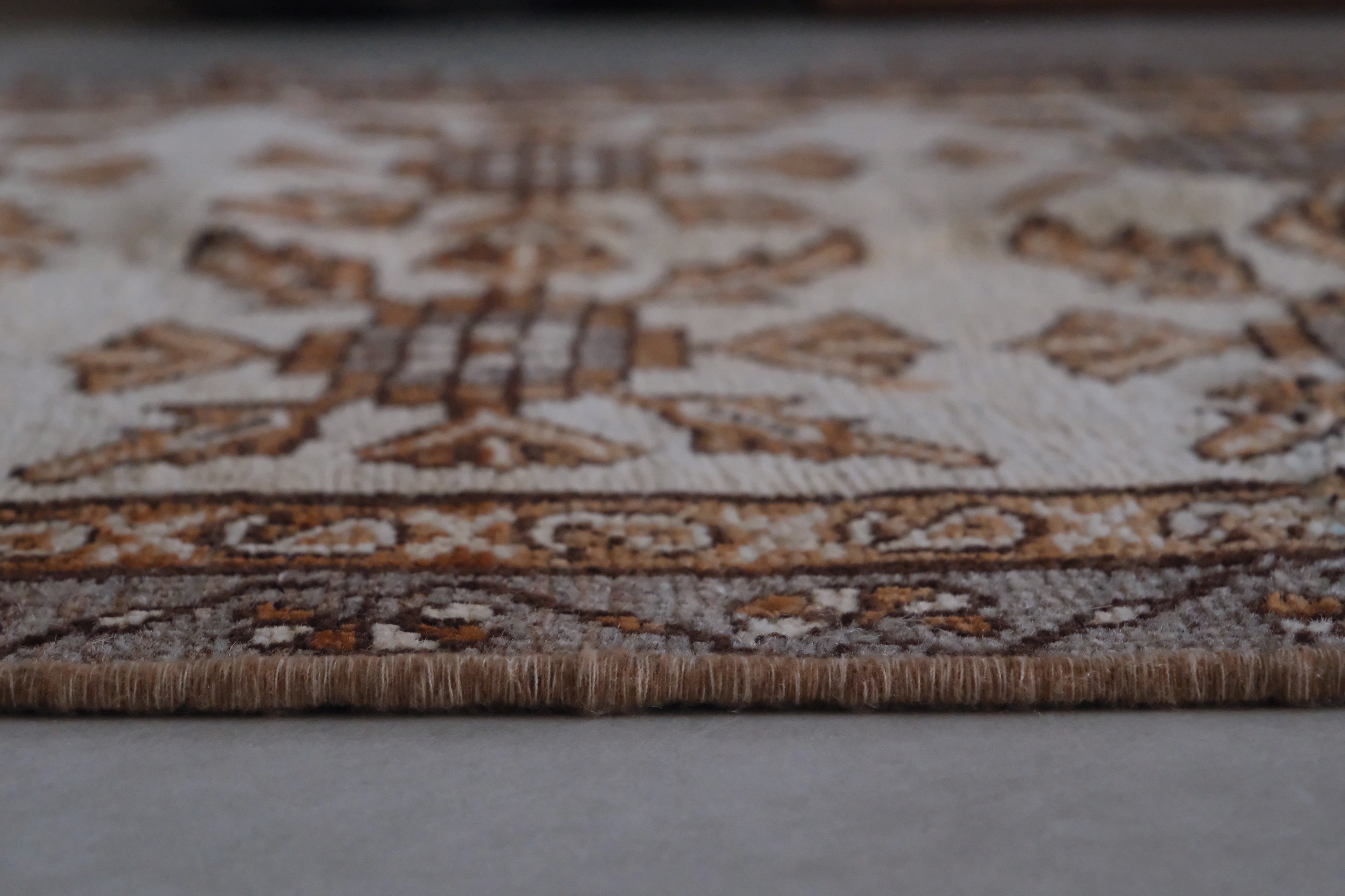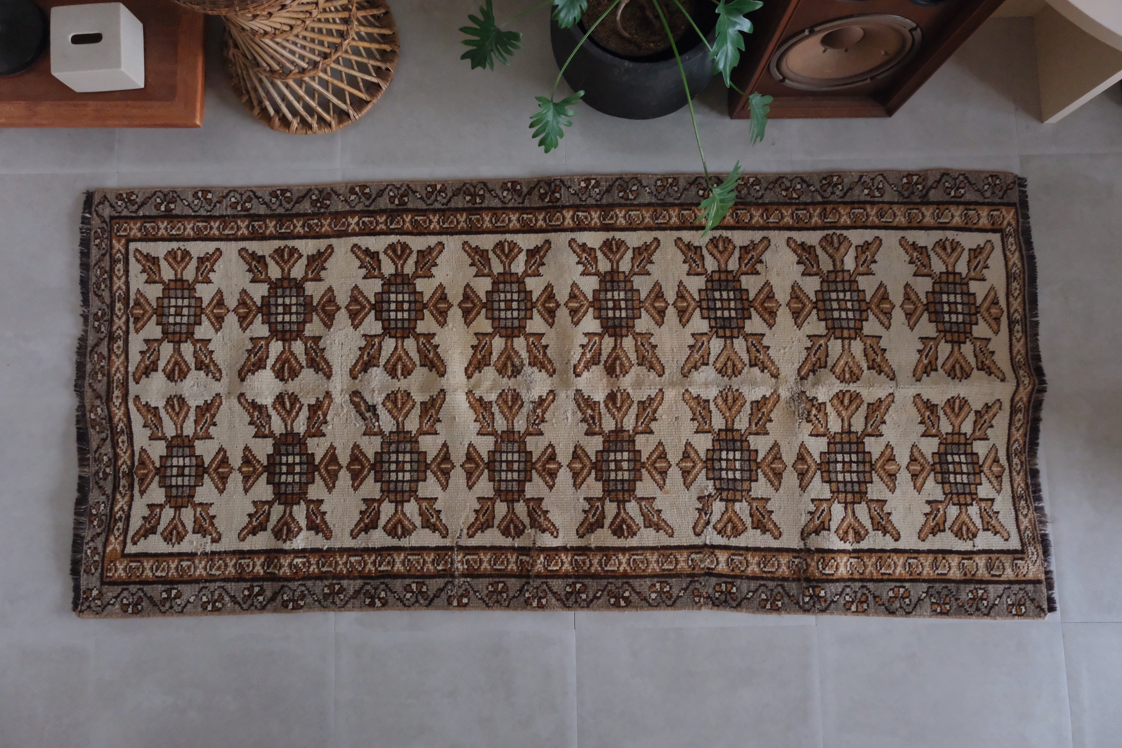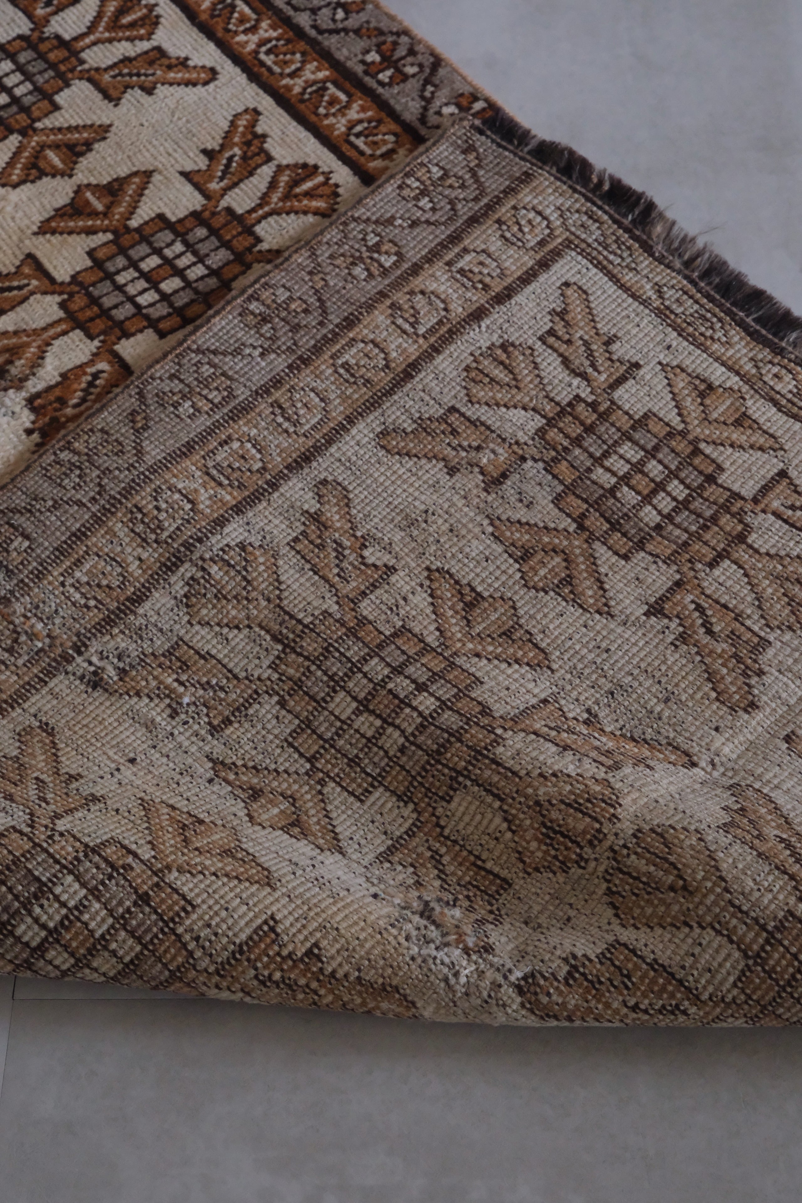 生成りベースに茶、グレー、ブラウンを基調とした人気の配色。パイル残りは良いですがところどころ強く擦れた部分があります。それでも全体的に状態は良く厚みもしっかりとあります。毛足はあるけど重たすぎないので一年中お使いいただけるラグです。