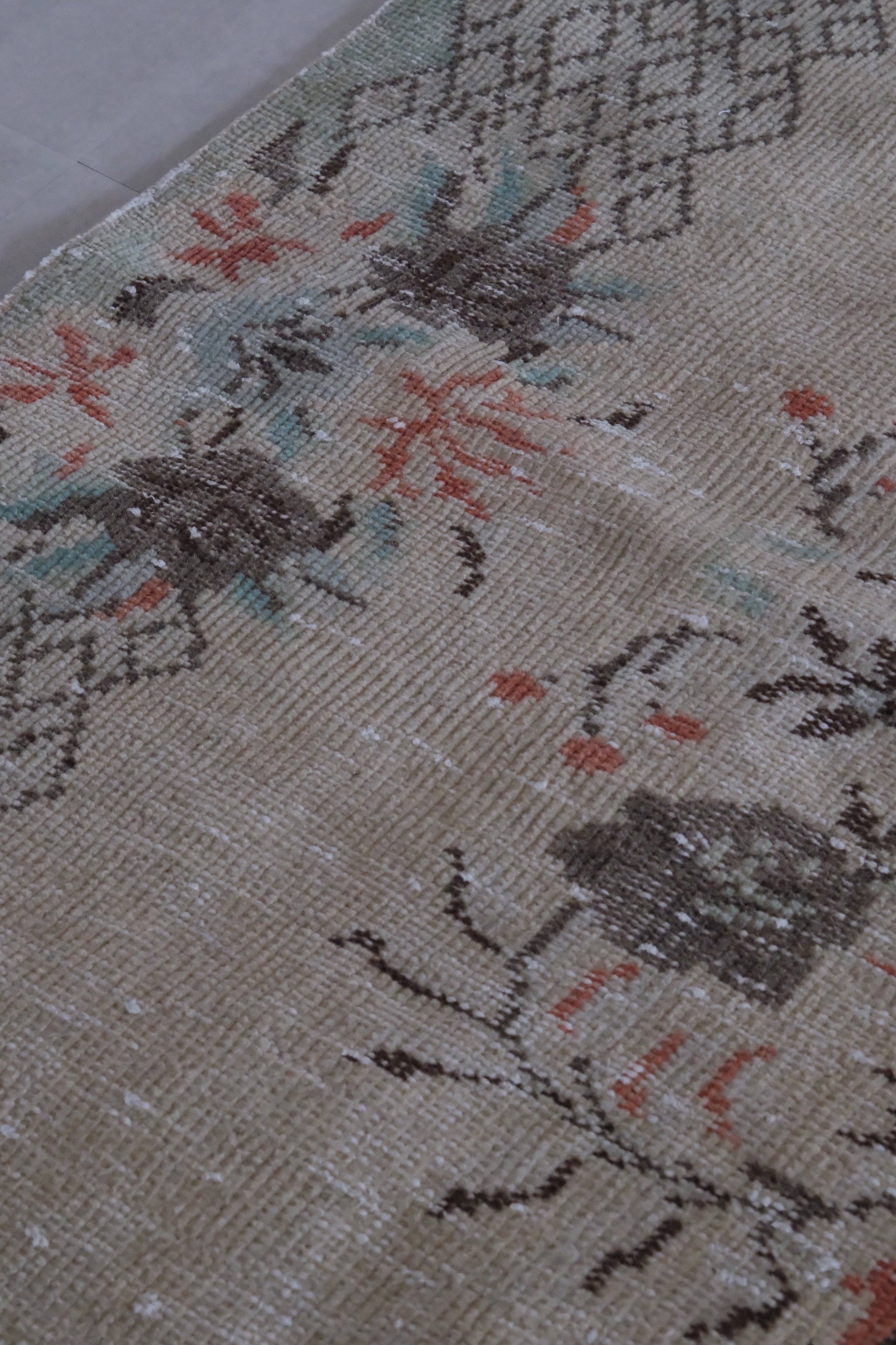 久々の超大判ラグ。くすんだベージュをベースに薄く淡いグリーンと繊細なオレンジが引き立つ上品なラグです。お部屋の主役にドン!っと敷きたい一枚です。全体を広げての撮影が困難でしたがシンメトリーな柄となります。カラッとした肌触りなので一年中お使いいただけます。