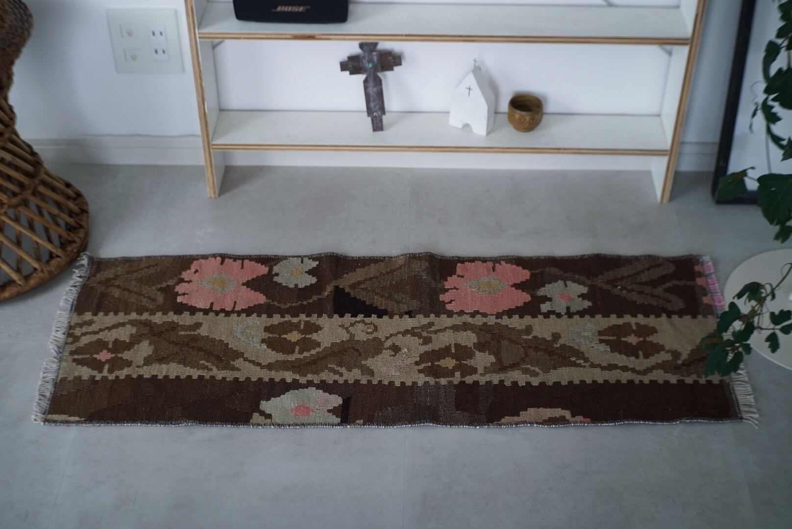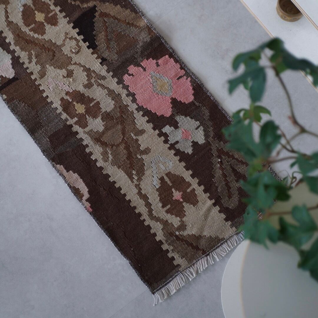 ブラウンベースにスモークピンクのキリムラグ。