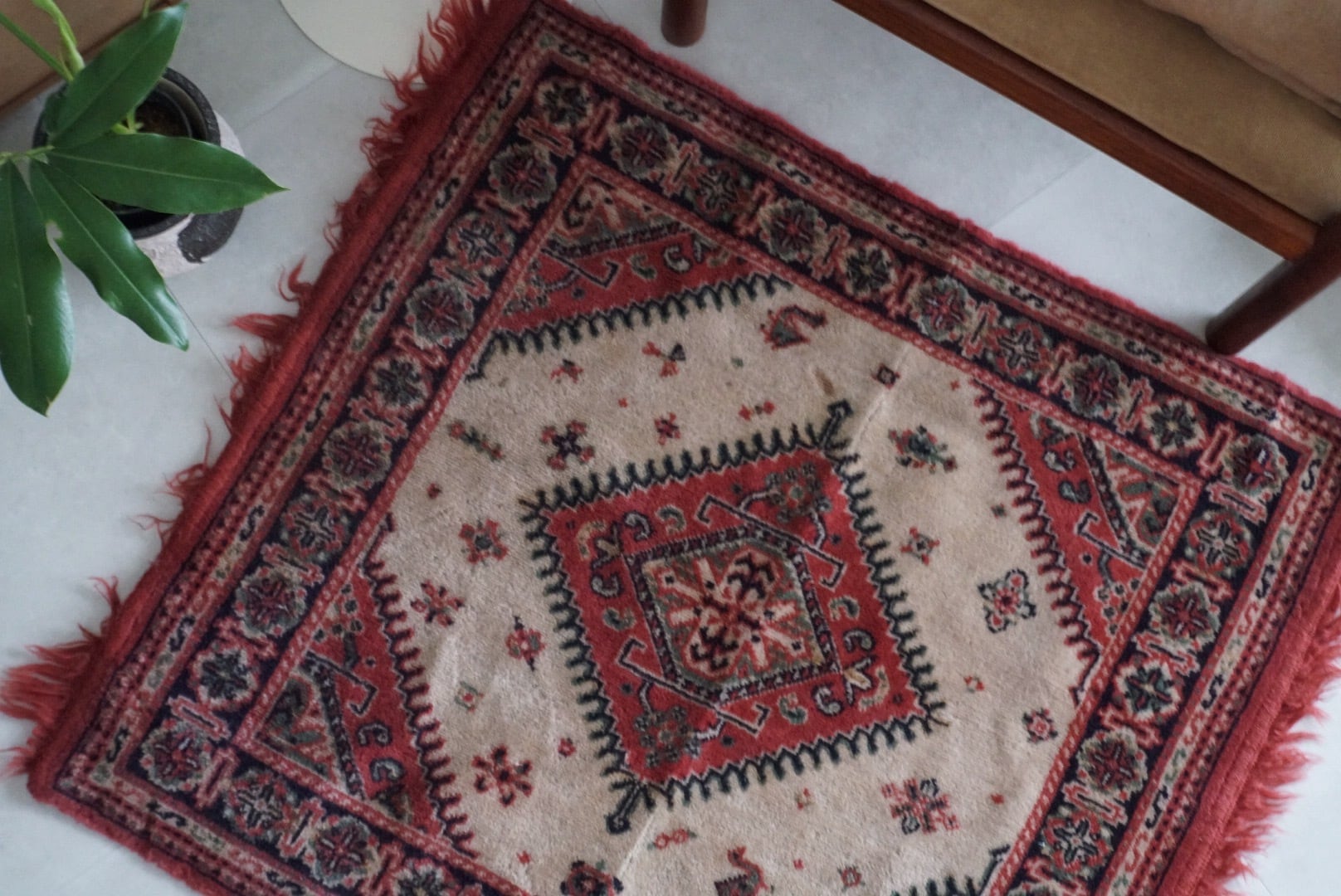 ベージュと赤のやわらかラグ。