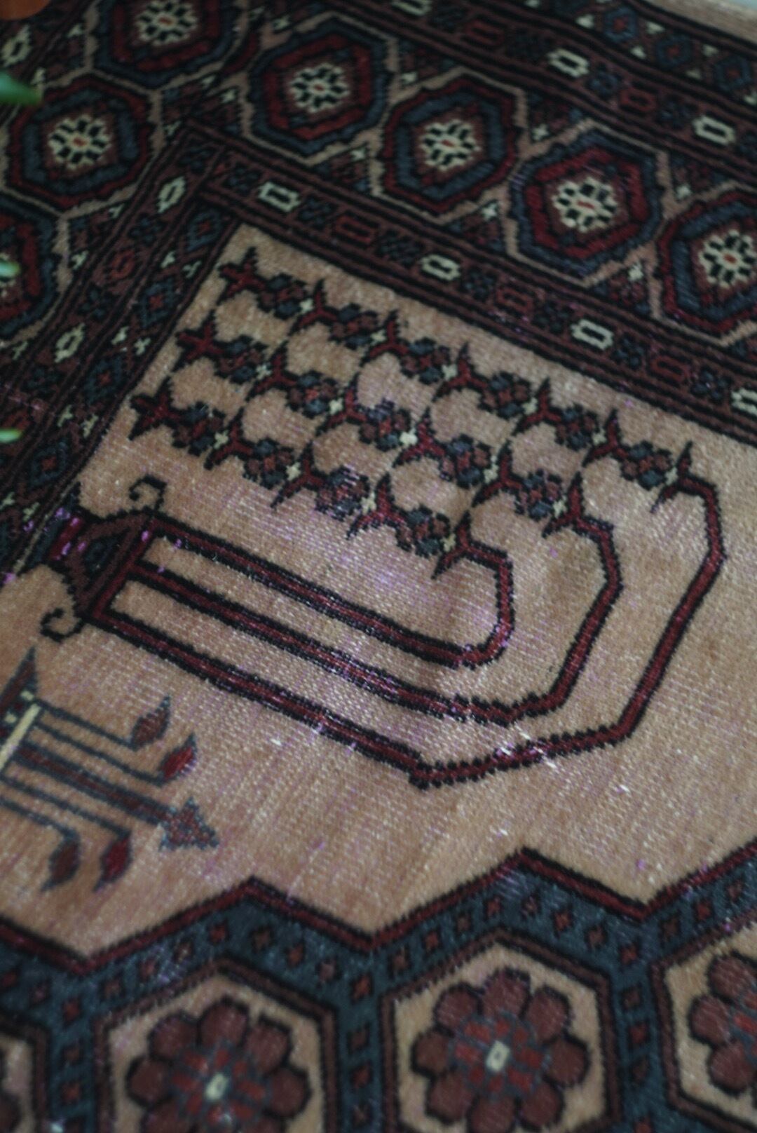 お花モチーフも入っているのでかっこよくなりがちなパキスタンラグでも可愛らしさも兼ねそろえている、なかなか珍しいデザインの一枚です。
