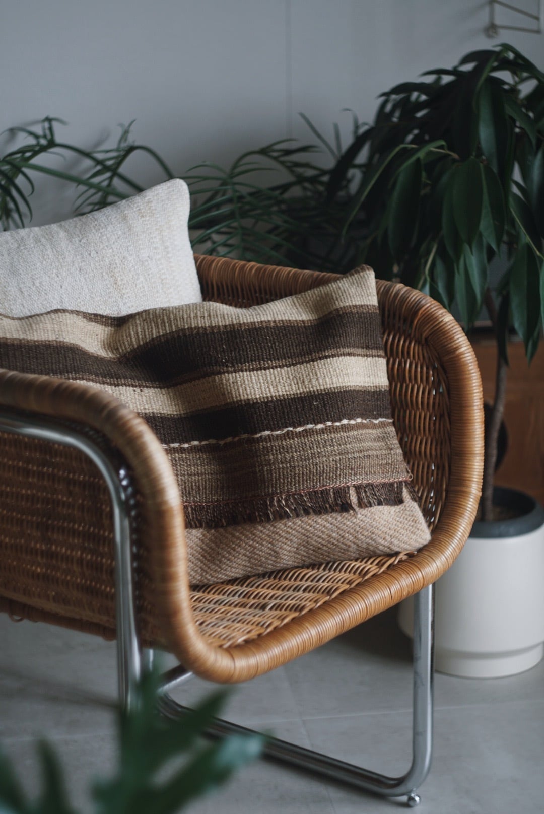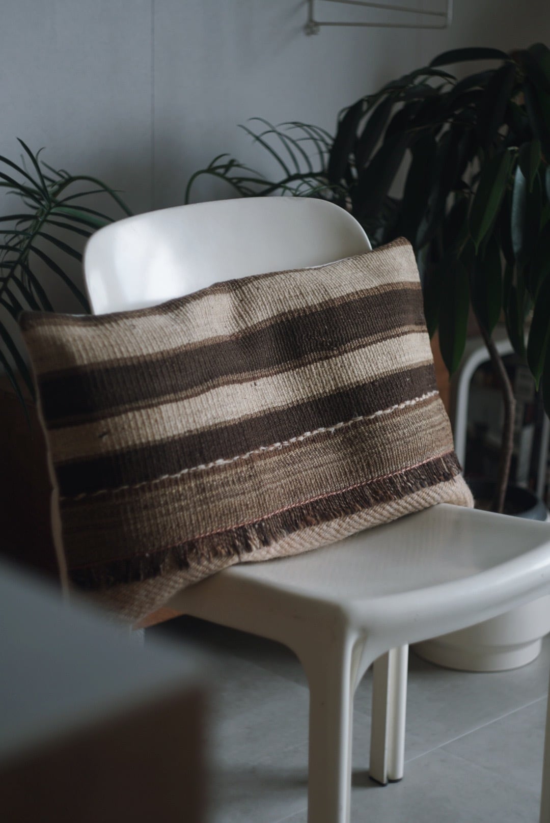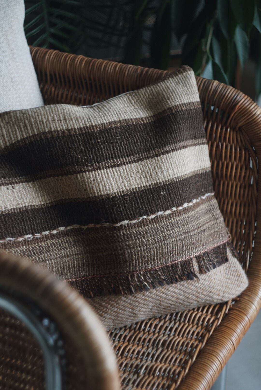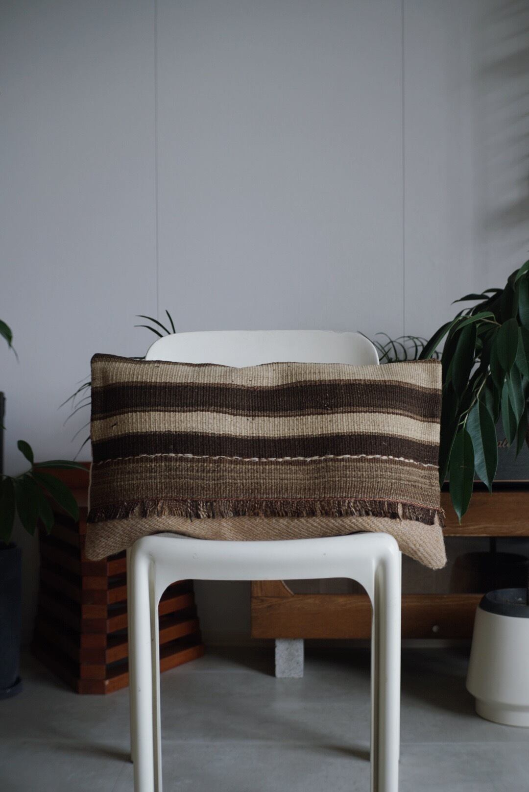 生成りと茶の王道キリムのラグクッション。
