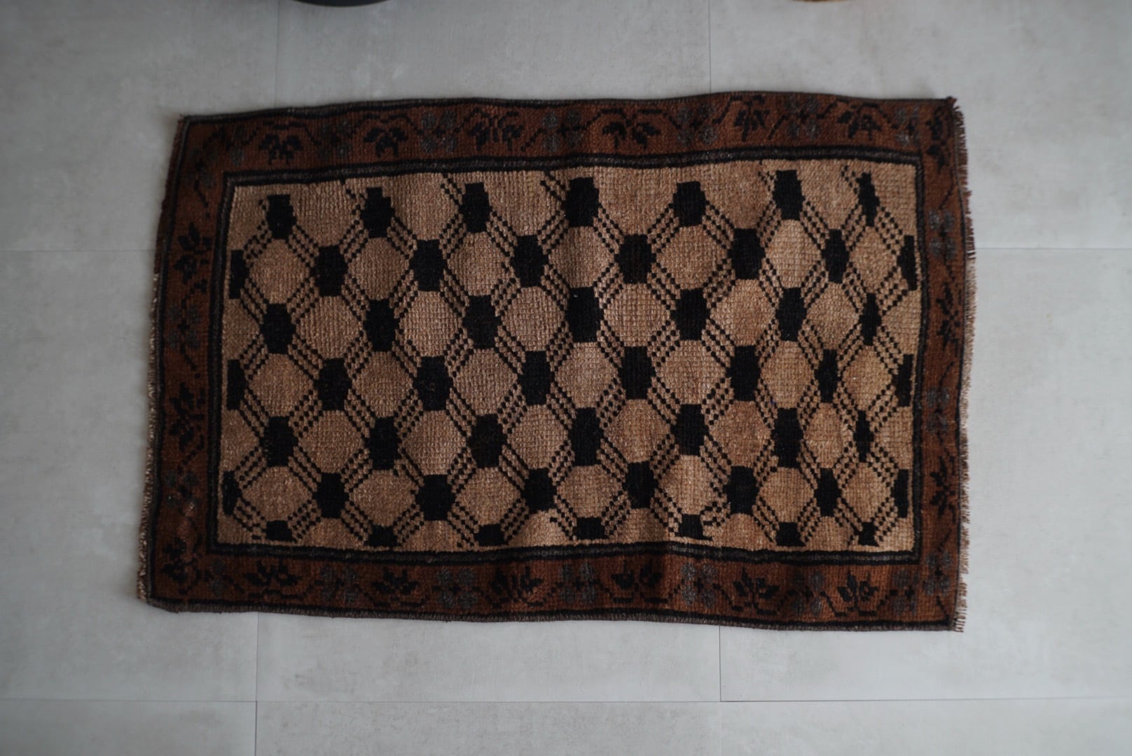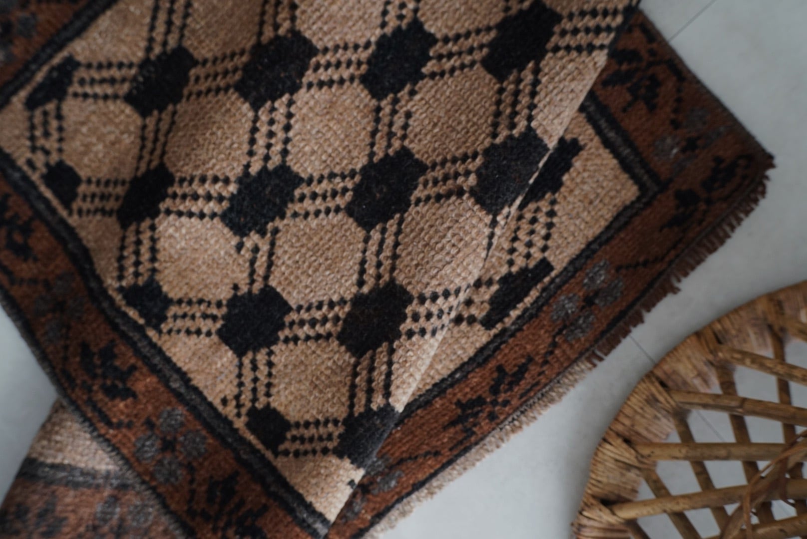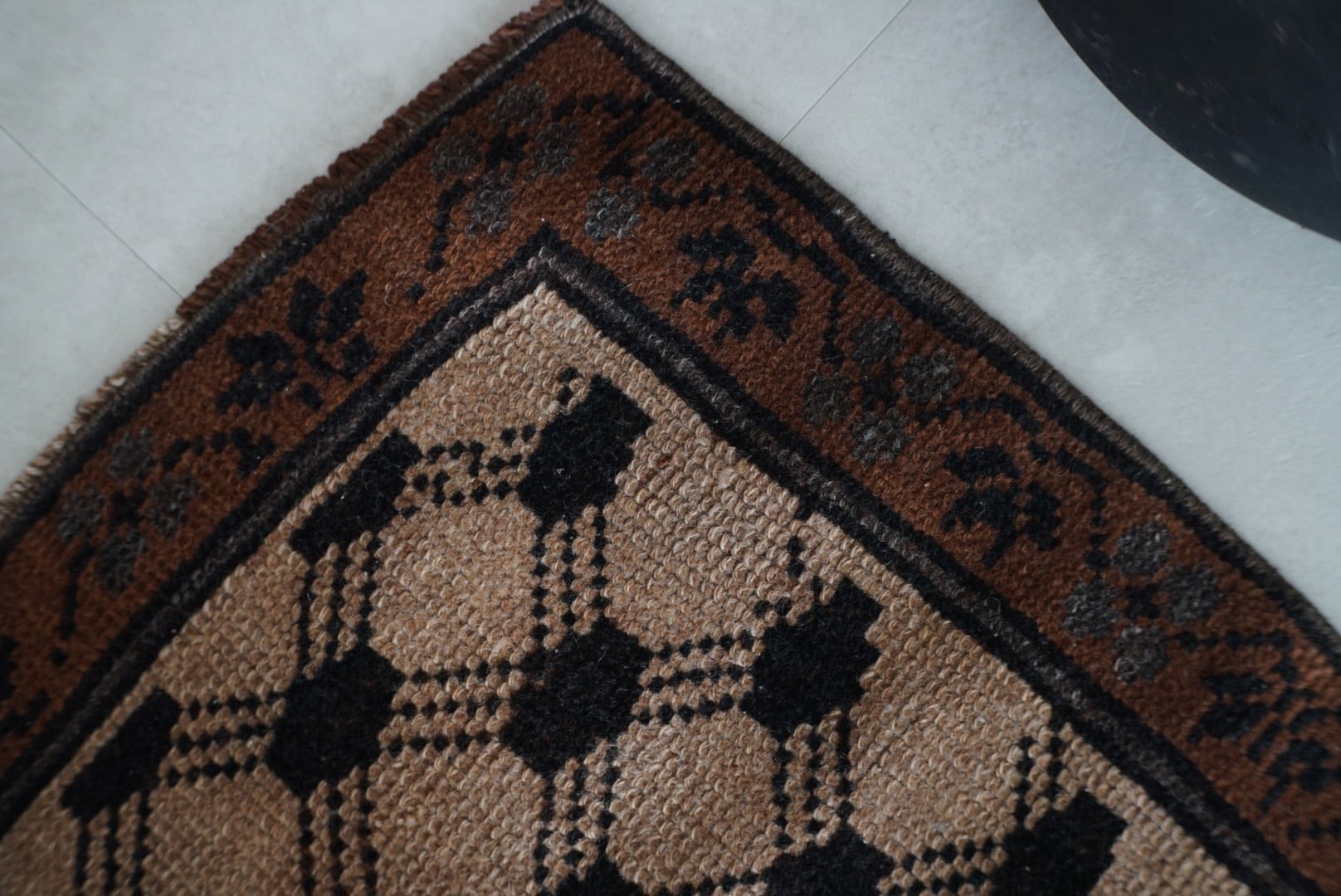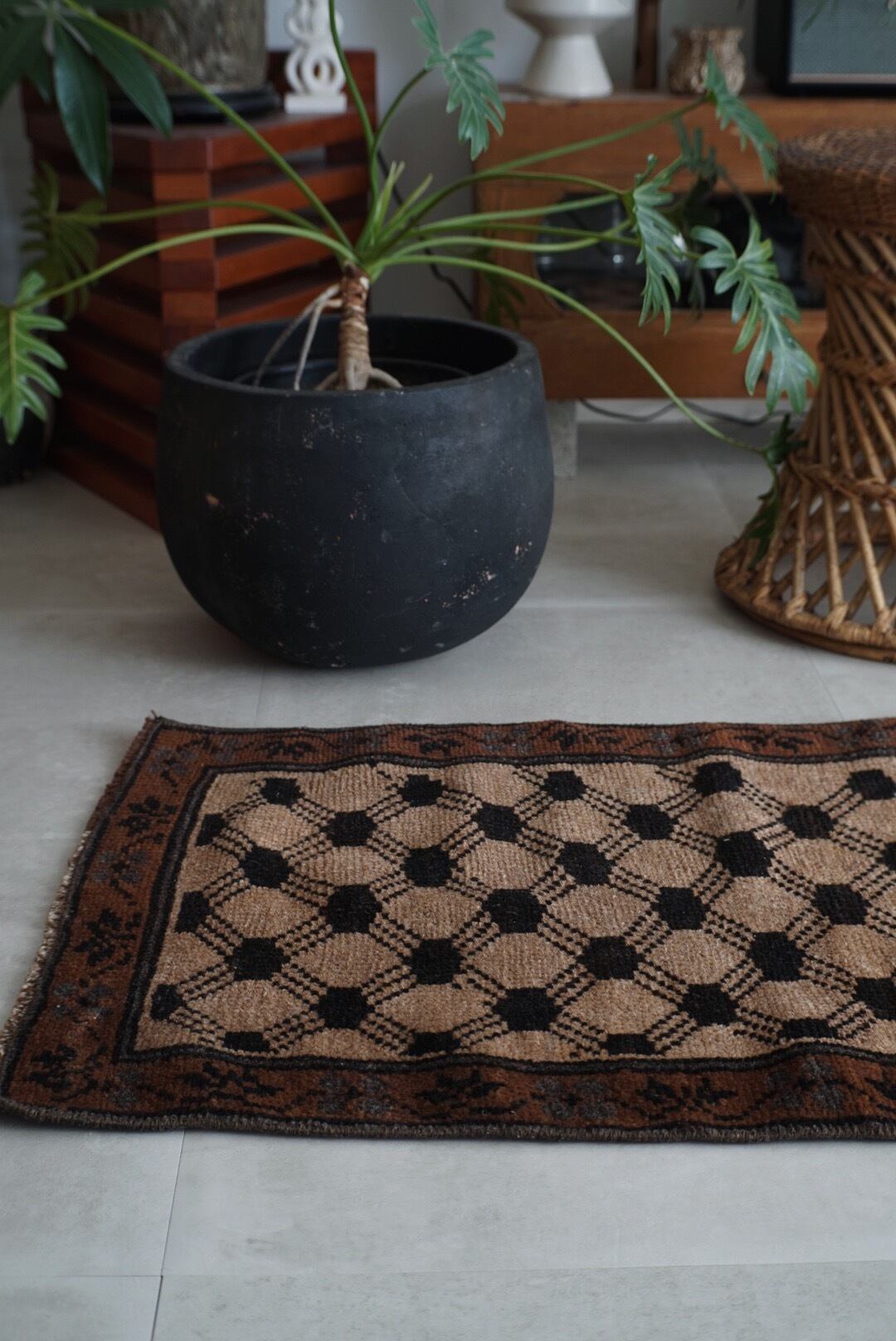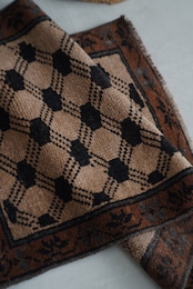 深いベージュのフィールドに描かれたブラックの菱模様。あまり見ないデザインのスモールラグです。ガードのブラウンの中にはブラックとグレーで描かれたお花柄。細かいところまで行き届いたデザインがとても素敵な一枚です。少し湾曲した形をしていますが使用には問題ございません。パイルなどの状態は良く柔らかい質感です。