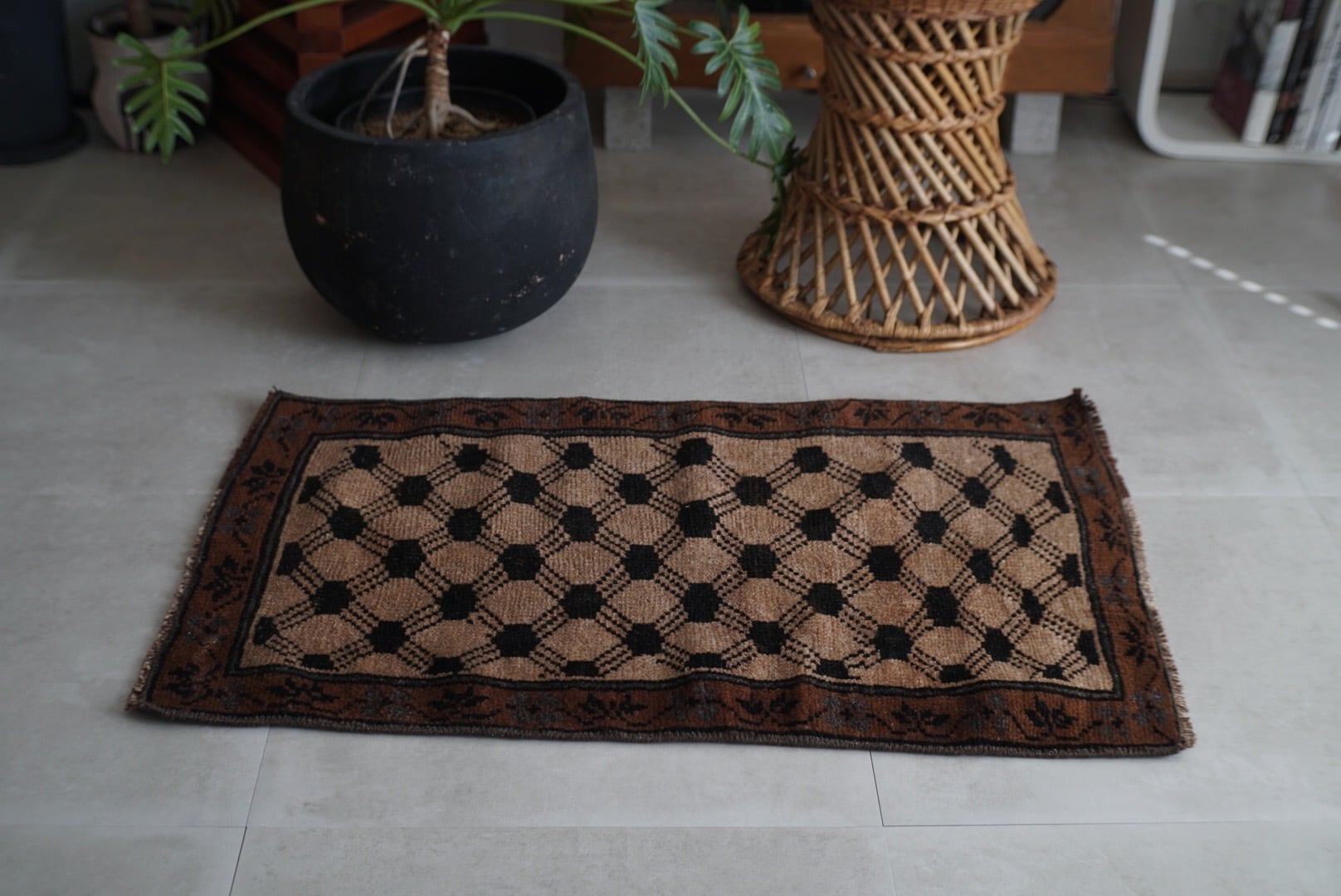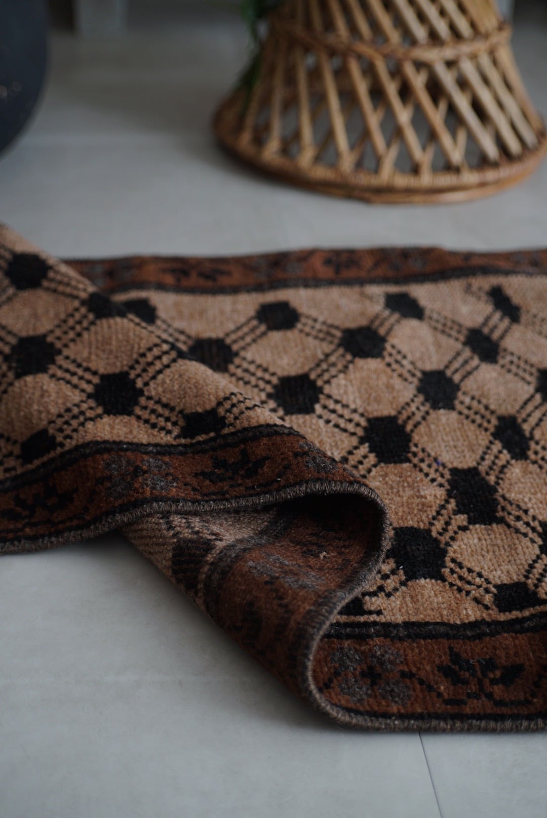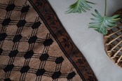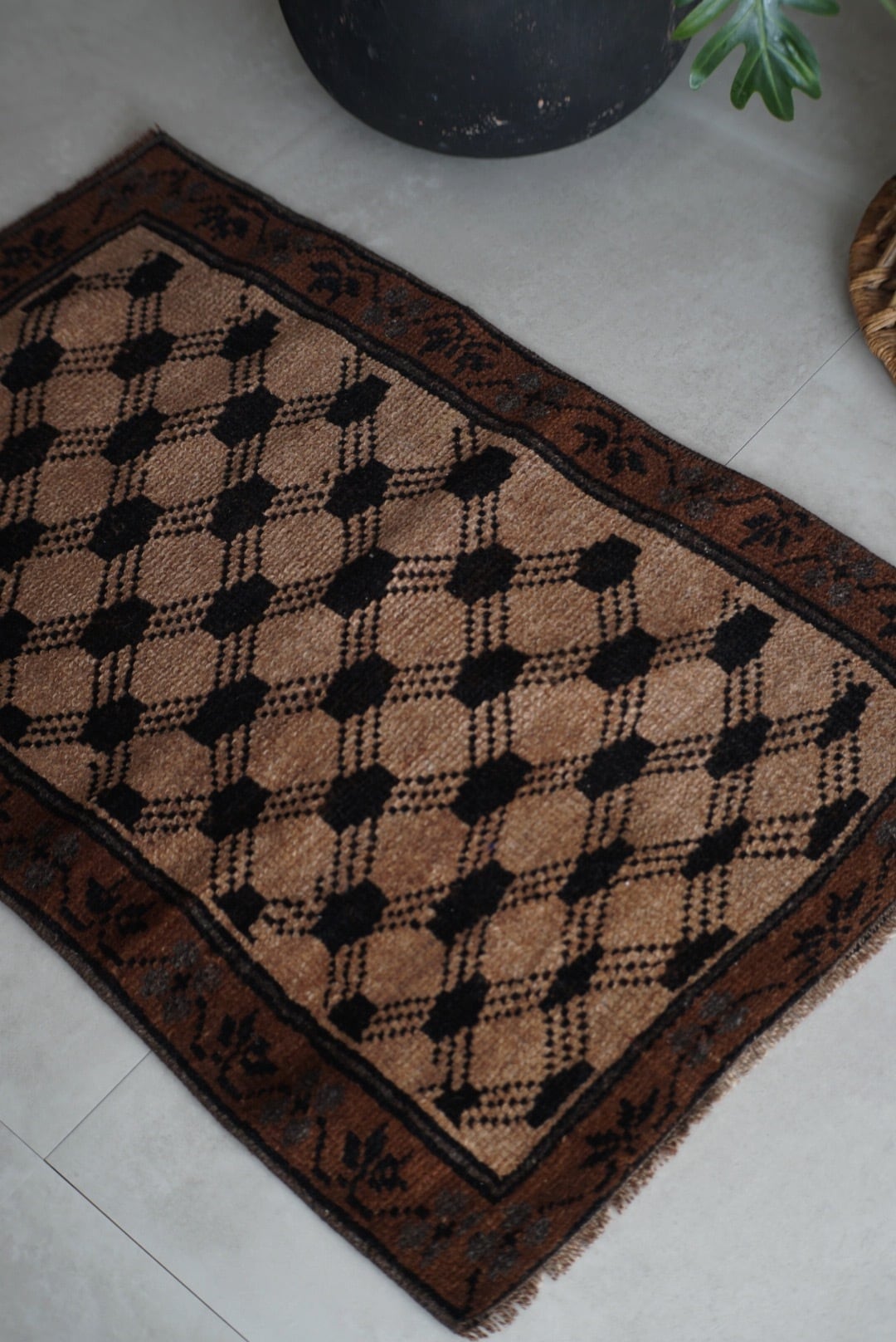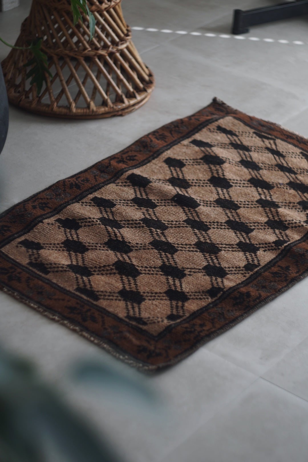 深いベージュのフィールドに描かれたブラックの菱模様。あまり見ないデザインのスモールラグです。ガードのブラウンの中にはブラックとグレーで描かれたお花柄。細かいところまで行き届いたデザインがとても素敵な一枚です。少し湾曲した形をしていますが使用には問題ございません。パイルなどの状態は良く柔らかい質感です。